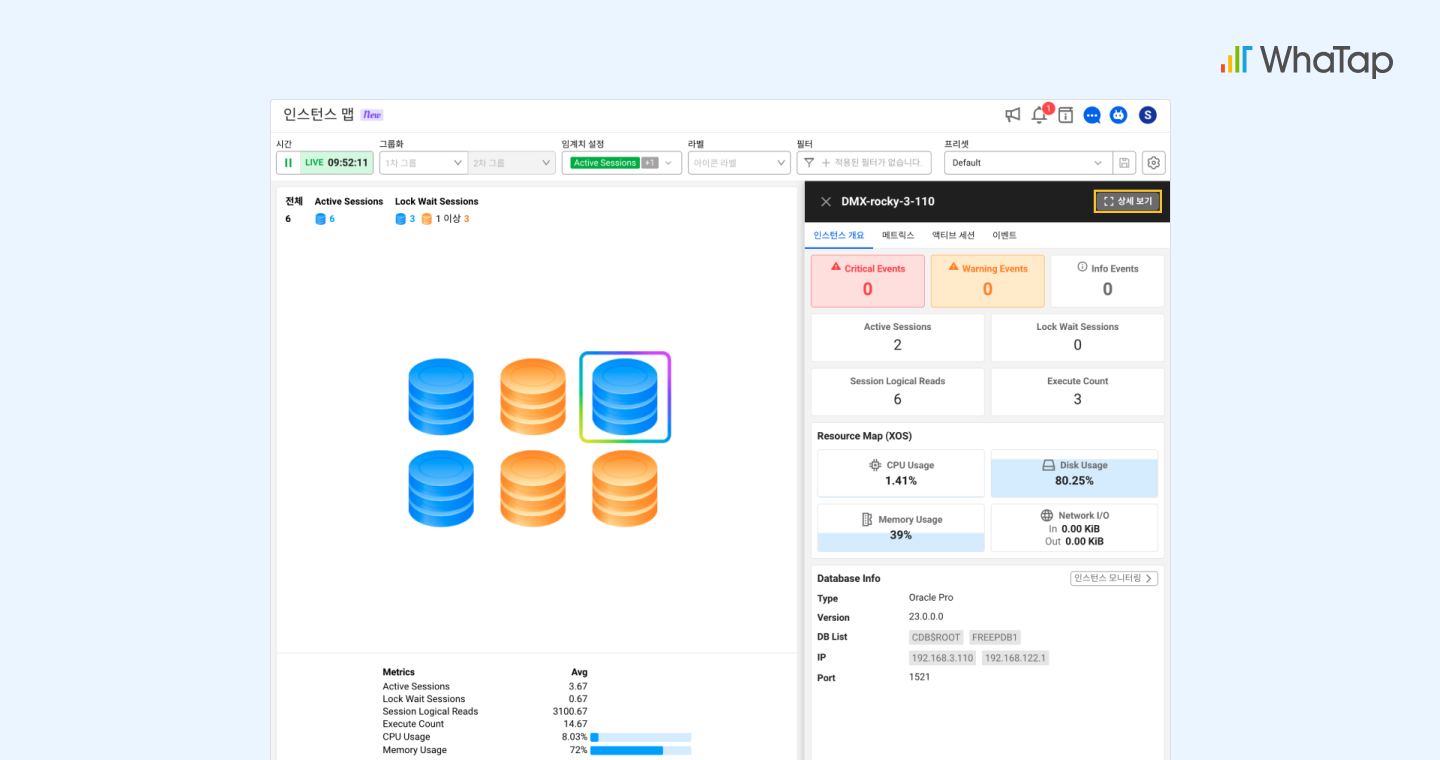 인스턴스 맵에서 문제가 발생한 인스턴스가 색상 변화로 바로 드러나고, 클릭 한 번으로 해당 지점의 상세한 상태를 열람할 수 있습니다. 락트리나 SQL 상세창, SQL 통계, 웨이트별 탑 SQL 같은 기능을 통해 어떤 쿼리가 병목을 일으켰는지, 원인이 풀 스캔 때문인지 등을 손쉽게 역추적할 수 있습니다. 또한, 시스템이 제공하는 플랜 가이드와 튜닝 방향 코멘트는 운영자가 문제를 해결하는 데 걸리는 시간을 크게 단축시켜 줍니다. |