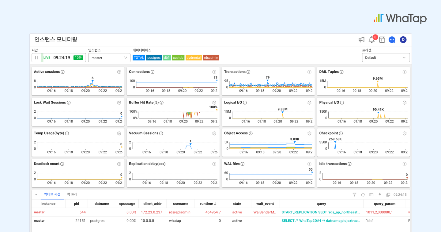 이 두 가지 사례가 보여주는 교훈은 분명합니다. 통합 모니터링은 단순히 DB 지표를 나열하는 도구가 아니라, 문제의 원인을 데이터 기반으로 정확히 짚고 빠르게 진단할 수 있는 체계라는 것입니다. 복잡한 클라우드 환경에서 와탭이 제공하는 통합 모니터링은 운영자에게 ‘전체를 꿰뚫어 보는 시각’을 제공하며, 신속하고 정확한 문제 해결을 가능하게 합니다.