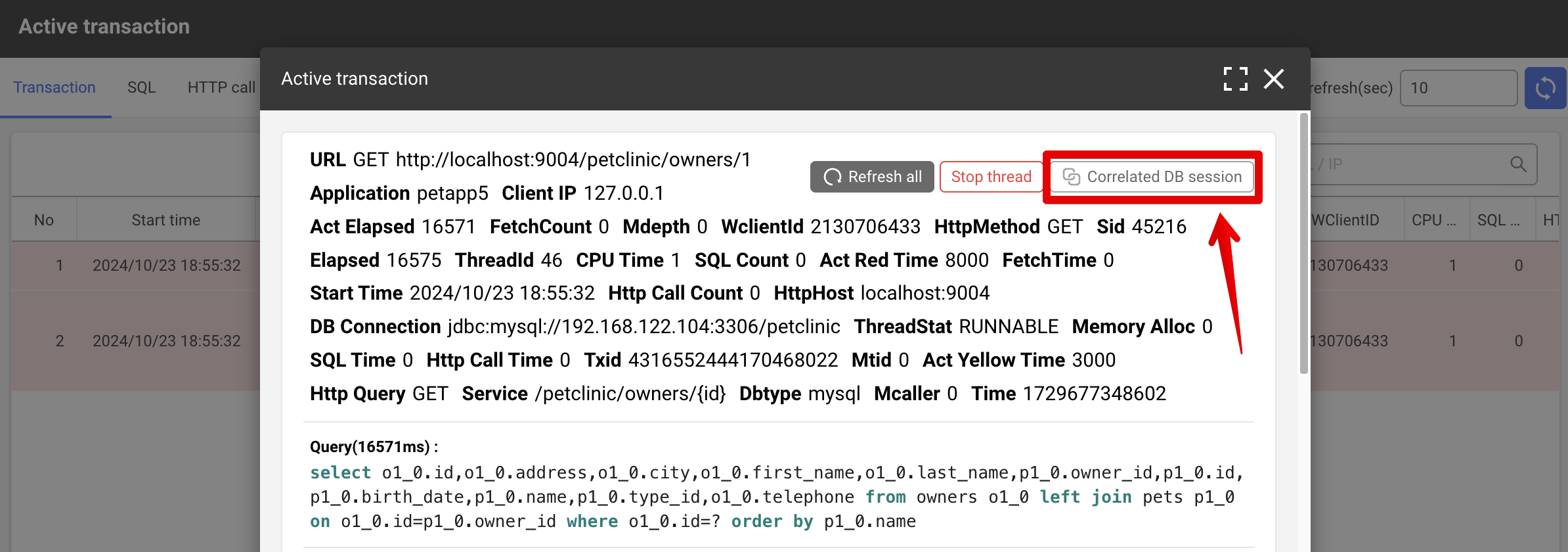 APM 화면에서 확인하는 '연계 DB 세션' 버튼 |