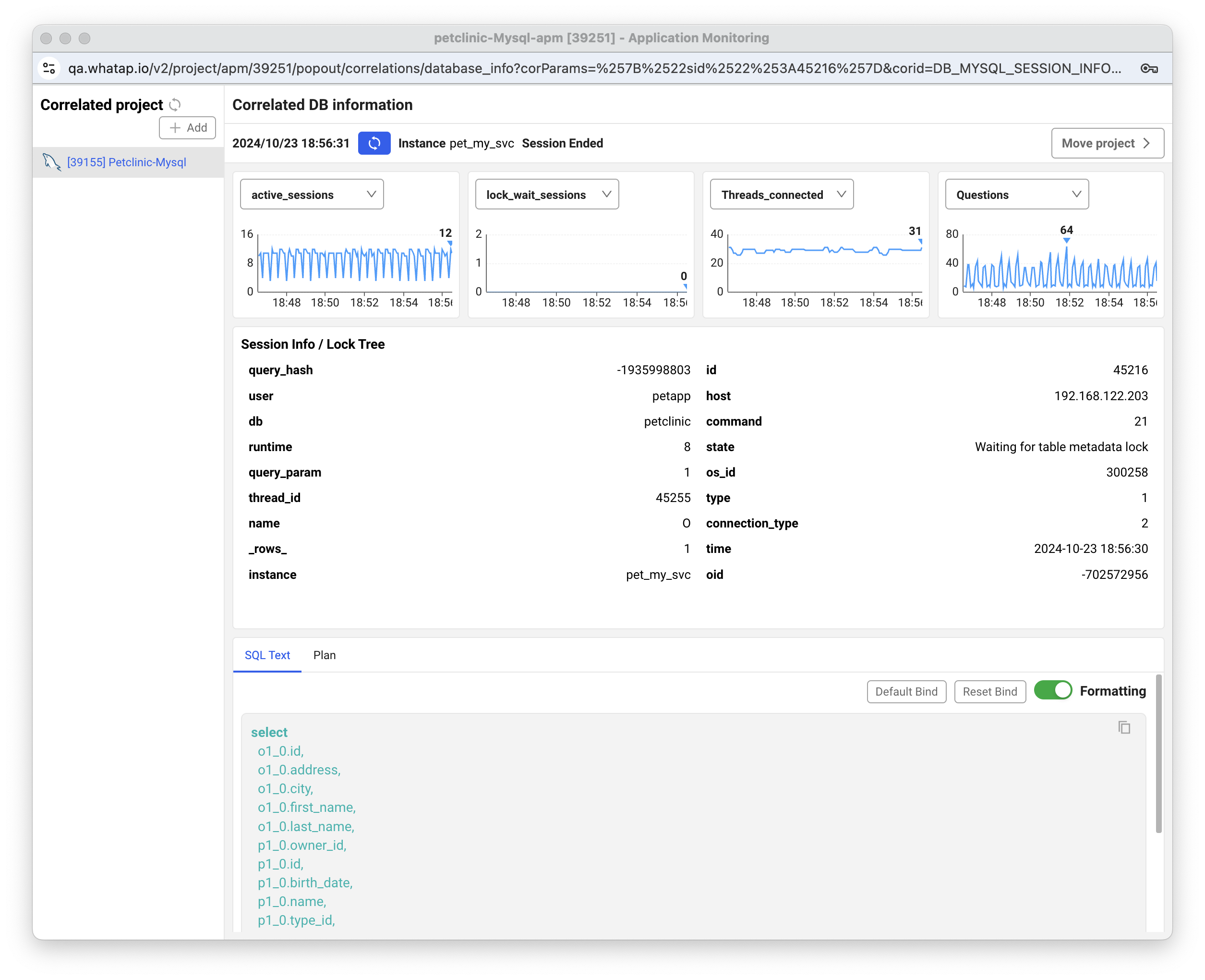 문제의 쿼리가 발견되면 ‘연계 DB 세션’ 버튼으로 곧바로 DPM 화면으로 이동합니다.