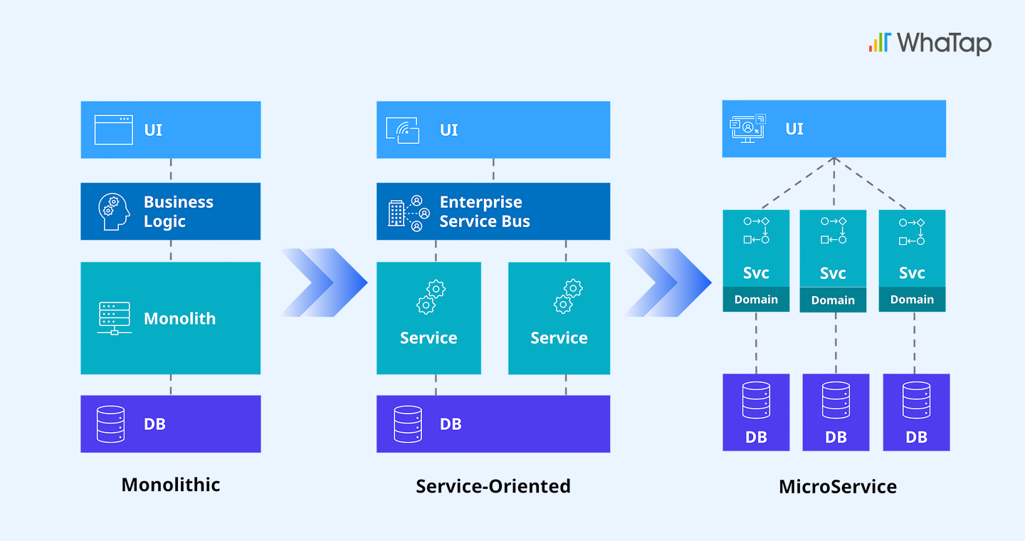 예전에는 구조가 단순했습니다. 여러 서비스가 하나의 통합 DB를 공유했고, 장애가 나면 시스템 전체가 영향을 받았습니다. 그래서 당시 운영의 핵심은 통합 DB를 안정적으로 모니터링하는 것이었죠. 전통적인 3계층 아키텍처에서는 웹·WAS·DB가 명확히 구분되어 있었고, 모니터링도 APM·DPM·서버·네트워크처럼 영역별로 나눠 관리할 수 있었습니다. 인프라 환경이 정적이었기에 가능한 방식이었습니다.