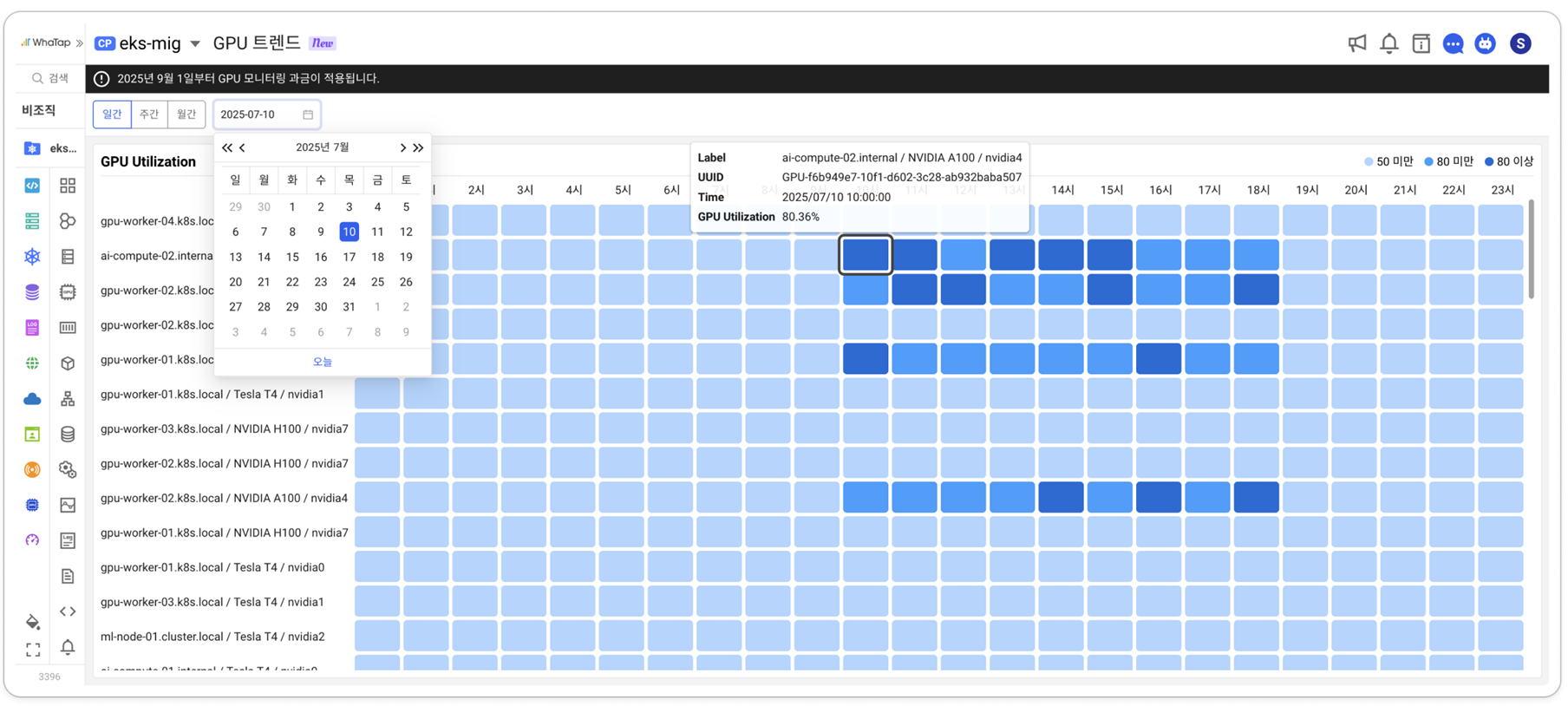셋째, MIG(Multi-Instance GPU)에 대한 가시성과 정확한 측정을 제공해야 합니다. 최근 많은 기업이 MIG를 지원하는 GPU를 도입하고 있습니다. 그러나 가상화된 인스턴스 내부의 동작을 들여다보기란 쉽지 않습니다. 모니터링 도구는 MIG 단위까지 세밀하게 추적·측정하여 실제 활용도와 성능을 정확히 반영해야 합니다.