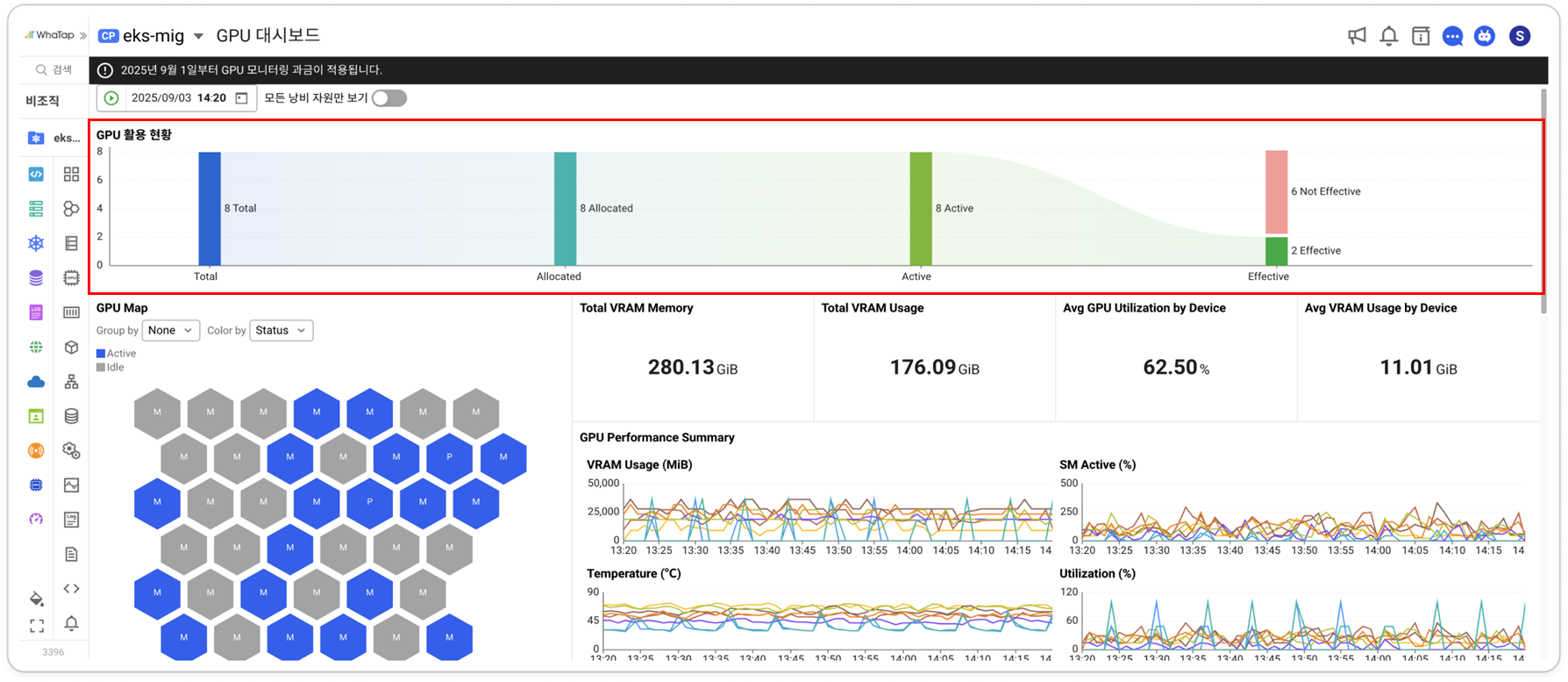 - 낮은 사용량 GPU 추적: 유휴 GPU를 드릴다운 방식으로 추적해 비용 낭비를 최소화합니다.