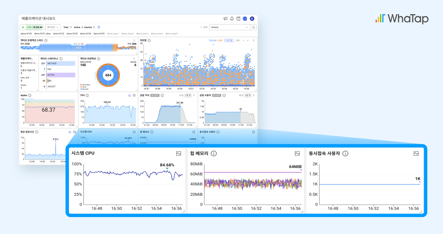 와탭 대시보드에서 확인 가능한 CPU, 메모리, 동시접속 사용자 수 데이터