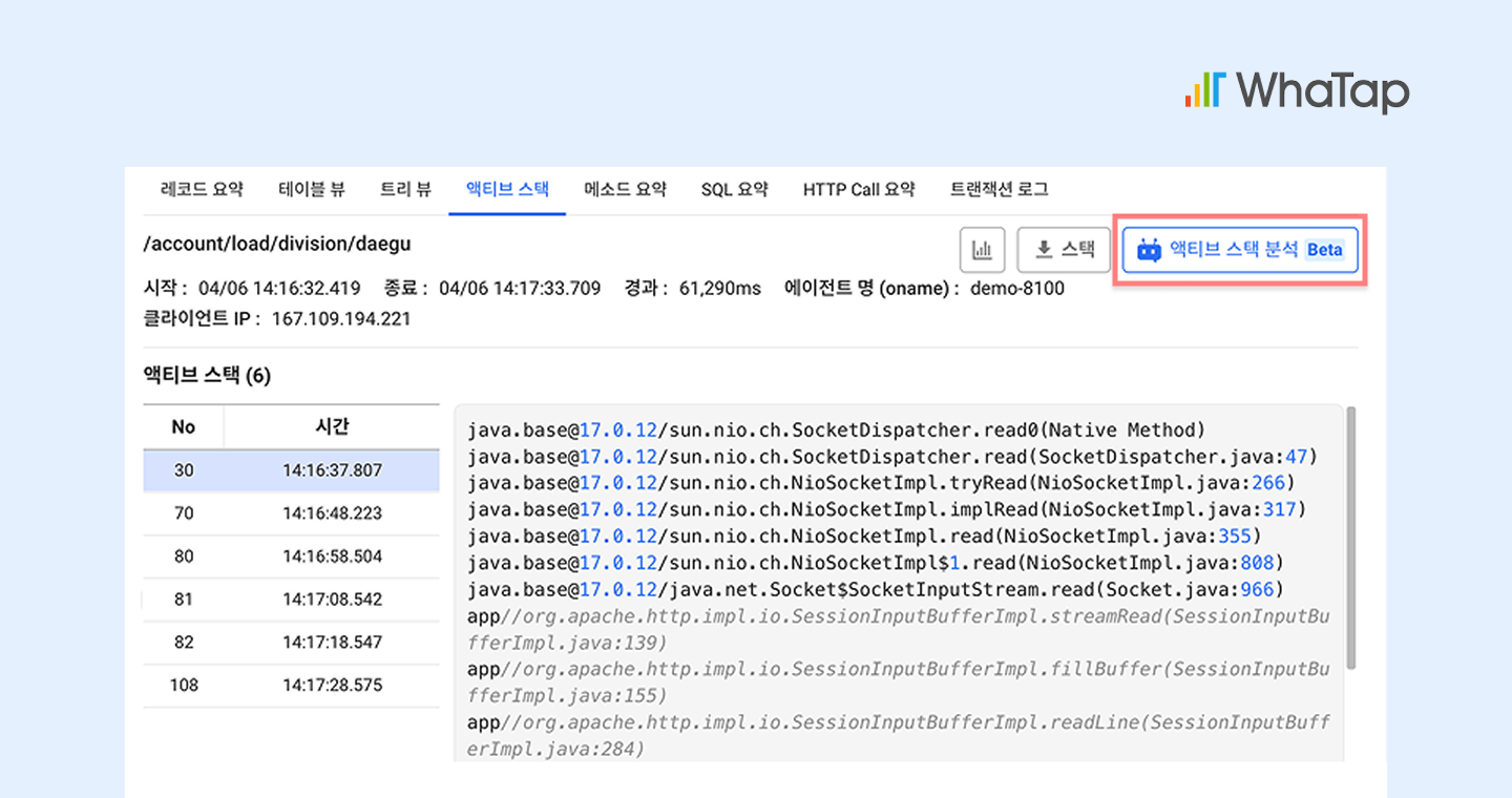 트랜잭션의 액티브 스택을 AI가 자동으로 분석해 주는 기능을 베타로 출시했습니다. 분석 버튼 한 번으로 수집된 스택 덤프를 기반한 전체 실행 흐름 요약, 반복 실행 패턴 감지, 심각도별(High/Medium/Low) 성능 이슈 진단, 우선순위에 따른 구체적인 개선 권장 사항까지 4개 섹션으로 정리된 결과를 확인할 수 있습니다.